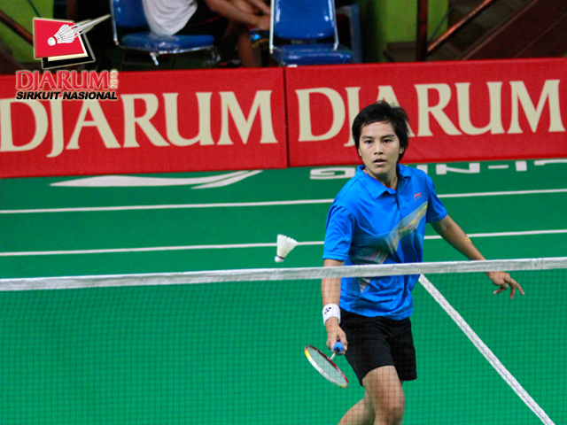 Arinda Sari (PB Djarum) menyambut serve dari Putri Sekartaji (Mutiara Bandung).