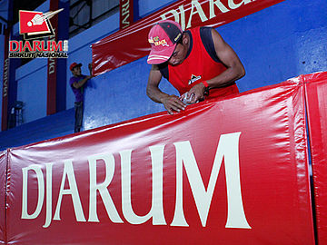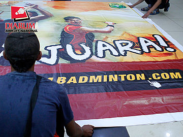 Salah satu pekerja sedang mengencangkan banner Djarum.