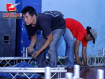 Dua pekerja sedang memasang besi-besi untuk menaruh giant banner.
