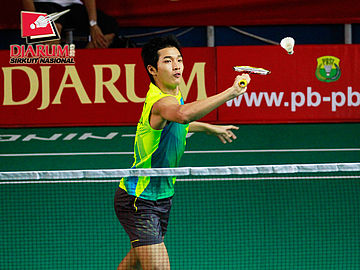 Jonathan Christie (Pelatnas) bersiap menyambar pengembalian tanggung dari Indra Setiawan (Pertamina Indonesia).