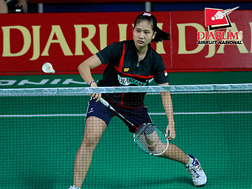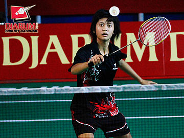 Marsa Indah (PB Djarum) mengembalikan kok ke arah Berliyan SUdrajat (Semen Gresik).