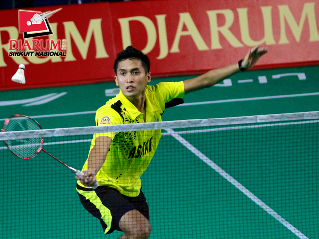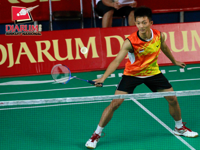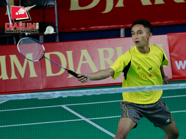Topas Wismoyo (SGS PLN) mengembalikan kok ke arah M. Bayu Pangistu (Pelatnas).