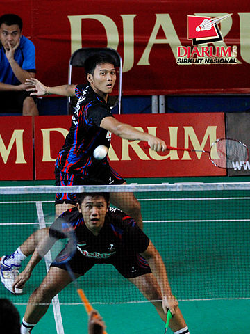 Arsya Isnanu Ardi Putra/Yantoni Edy Saputra (PB Djarum) mengembalikan kok ke arah pasangan Alwi Mahardika/Felix Eka (Exist).