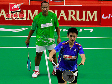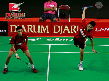 Abu Bakar / Tedi Supriadi (Djarum Kudus) mengembalikan smash lawan.