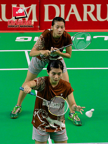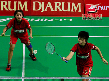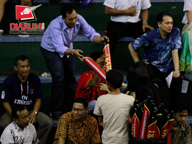 Seiko Wahyu Kusdianto / Nurbela Kwanrico (Djarum Kudus) mengembalikan kok ke arah Anggun Nugroho / Keshya Nurvita Hanadia.