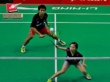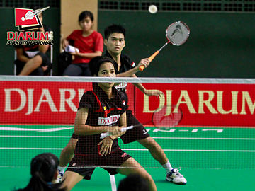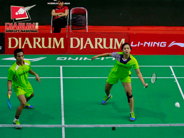 Abu Bakar / Febriani Endar Kusumawati (Djarum Kudus) bersiap mengembalikan kok ke arah Rafli Rizky Ristian / Tri Okta Shelina (Mutiara Bandung).
