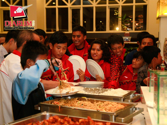 Para pebulutangkis PB Djarum saat berkumpul di depan meja makanan.
