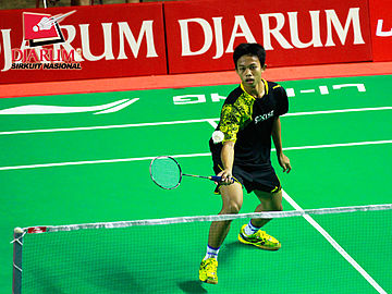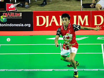 Bandar Sigit (Sarwendah) bersiap mengembalikan shuttlecock ke arah Garry Lam (Exist).