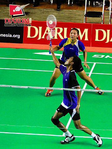 Trikus Haryanto/Nadya Melati (Pertamina) mengembalikan shuttlecock ke arah pasangan Dwi Setiawan/Lita Nurlita (Tsunami/SGS PLN).