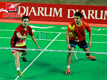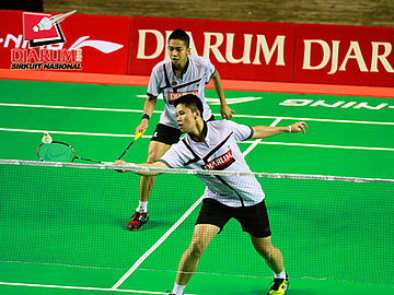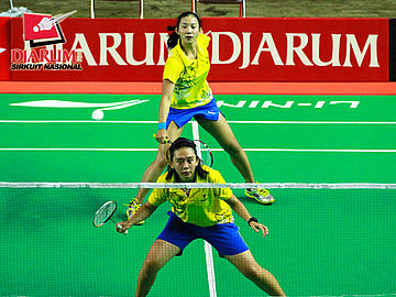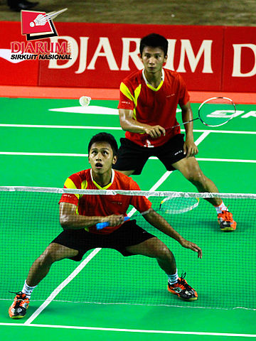 Rian Swastedian/Alfian Sangaji (Pusdiklat Jaya Raya) bersiap menyambut pengembalian dari pasangan Hantoro/Ricky Alverino (PB Djarum).