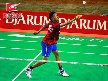 Pebulutangkis tunggal remaja putra, Andri Wijaya (PB Djarum) melepaskan backhand ke arah Panji Ahmad (Mutiara Bandung).