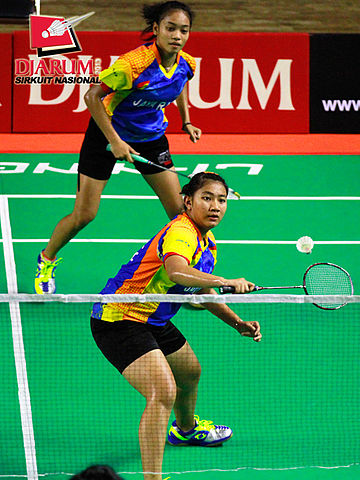 Pasangan ganda dewasa putri, Aris Budiharti/Dian Fitriani (Pusdiklat Jaya Raya) menghadang serangan yang dilepaskan Devi Tika Permatasari/Keshya Nurvita Hanadia (SGS PLN).