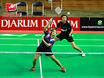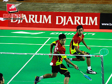 Bandar Sigit (Sarwendah) mengembalikan shuttlecock ke arah Alamsyah Yunus (Pertamina).