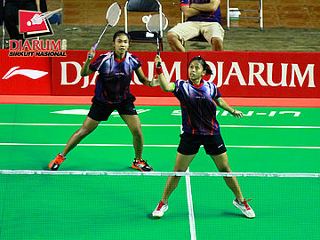 Clara Titi/Desaula Gendi (Pusdiklat Jaya Raya) mengembalikan shuttlecock ke arah pasangan Masita Mahmudin/Uswatun Khasanah (Pusdiklat Jaya Raya/PB Djarum).