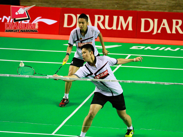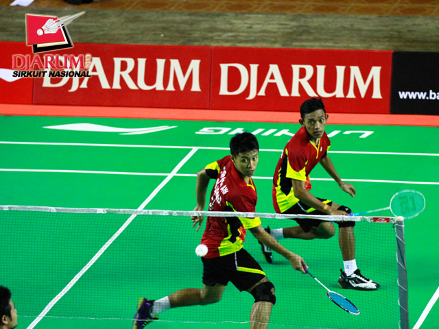 Pasangan ganda dewasa putra, Alvent Yulianto/M. Nur Roffli (Jaya Raya Suryanaga/Pusdiklat Jaya Raya) mengembalikan shuttlecock ke arah Chrisna Adi/Ridho Akbar (Halim).