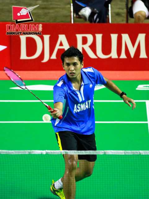 Pebulutangkis tunggal dewasa putra, Alamsyah Yunus (Pertamina) bersiap mengembalikan shuttlecock ke arah Bandar Sigit (Sarwendah).
