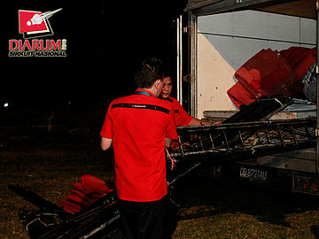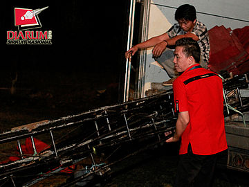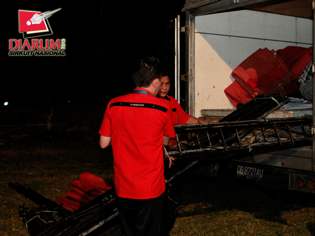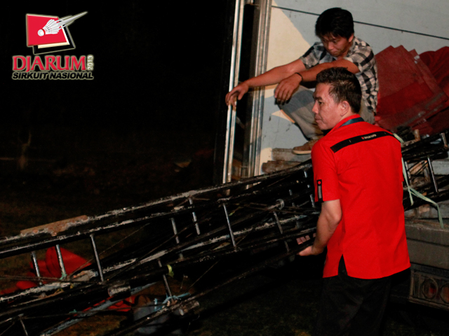 Dua pekerja sedang menggotong perlengkapan logistik Djarum Sirkuit Nasional Sulut Open 2013 di GOR Ari Lasut, Manado.