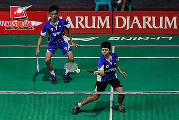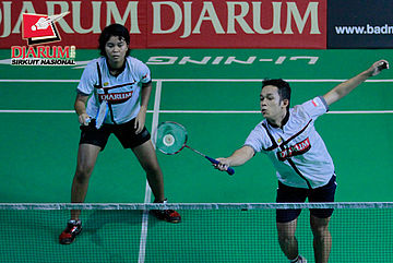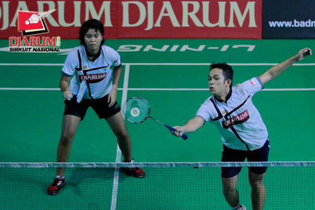 Tedi Supriadi/Ristya Ayu (PB Djarum) bersiap menyambar pengembalian tanggung dari Yohanes Rambitan/Putri Tahir (PB Kasih/Bayangkara).