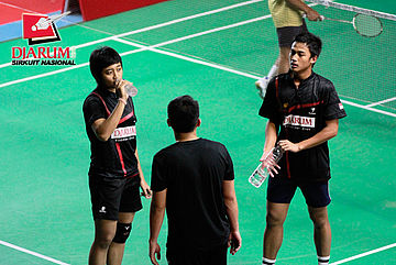 Angger Sudrajad/Revenska Cintya (PB Djarum) saat mendapatkan pengarahan dari pelatih.