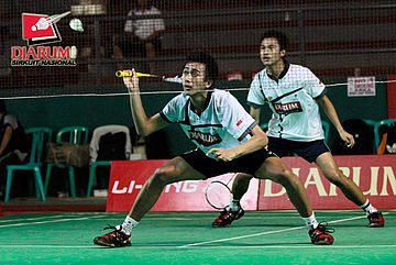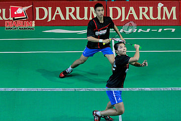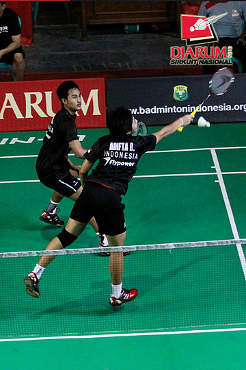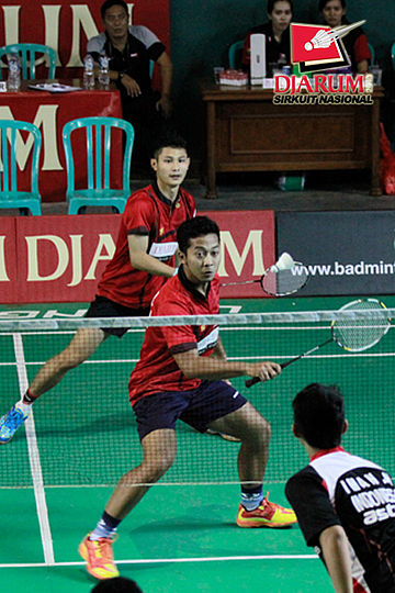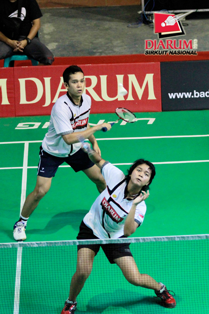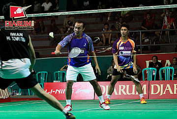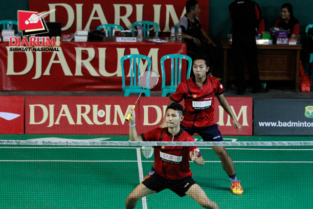 Kenas Adi/Seiko Wahyu (PB Djarum) bersiap menyambut pengembalian dari Imam Hudori/M. Tegar (Aufa).