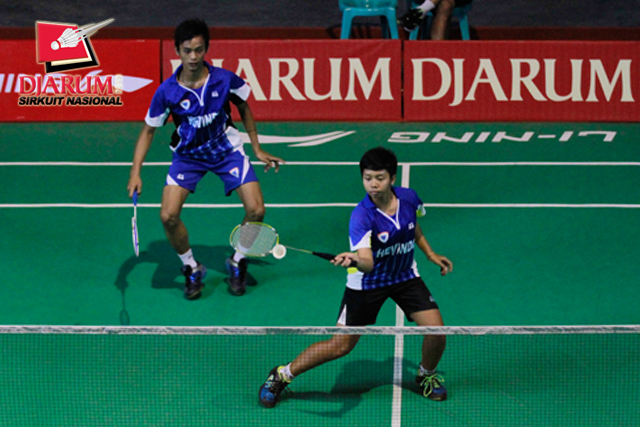 Angger Sudrajad/Revenska Cintya (PB Djarum) mengembalikan shuttlecock ke arah M. Maftuki/Elizabeth Matindas (Pelatprov DKI Jakarta/SGS PLN).