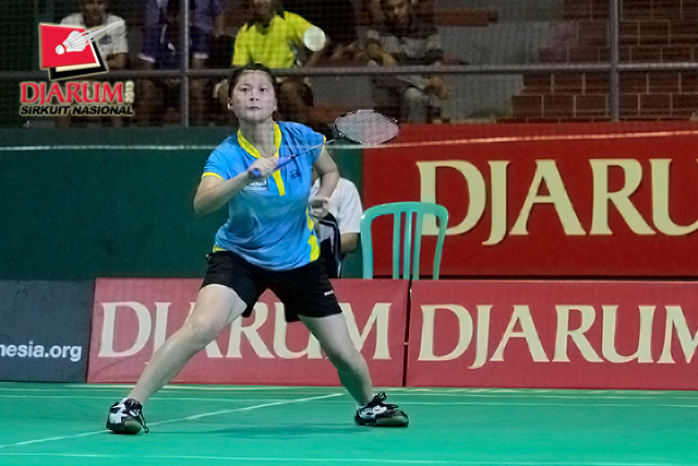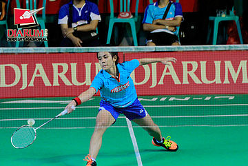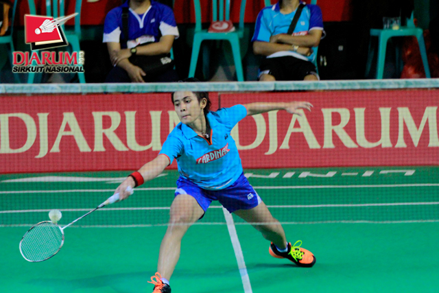 Tike Arieda (Jaya Raya Suryanaga) mengembalikan shuttlecock ke arah Dinar Dyah (PB Djarum).