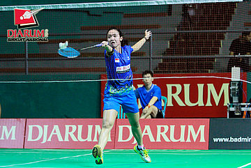 Eka Fajar (Jaya Raya) mengembalikan shuttlecock ke arah Elham Saptono (Candrra Wijaya).