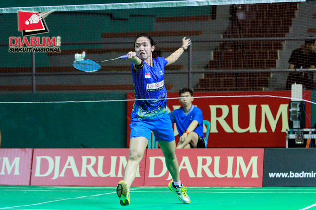Ana Rovita (PB Djarum) mengembalikan shuttlecock ke arah Elizabeth Purwaningtyas (SGS PLN).