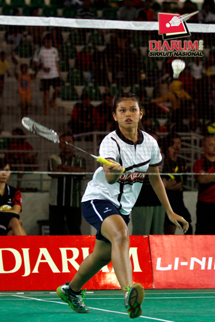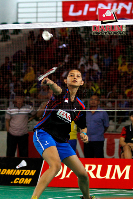 Aida Arum (PB Djarum) berusaha mengembalikan shuttlecock ke arah Fina nuraena (SGS PLN).