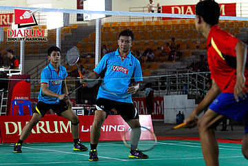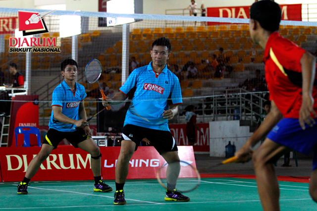Abu Bakar/Tedi Supriadi (PB Djarum) bersiap mengembalikan shuttlecock ke arah Rajid Patriawan/Rino Ramadhika (Pelatprov DKI Jakarta).