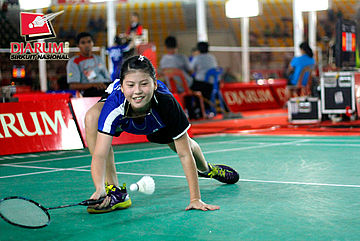 Selebrasi Arinda Sari Sinaga (PB Djarum) setelah berhasil mencuri poin dari Mitzi Abigail (Sarwendah).