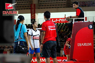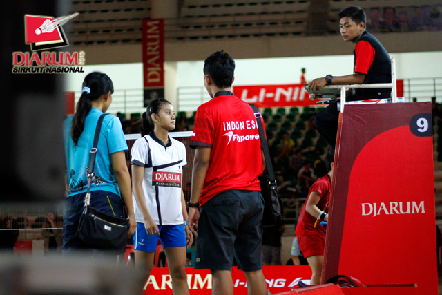 Tunggal taruna putri PB Djarum, Devi Yunita (tengah) saat mendapatkan arahan dari pelatih di sela jeda set pertama