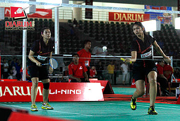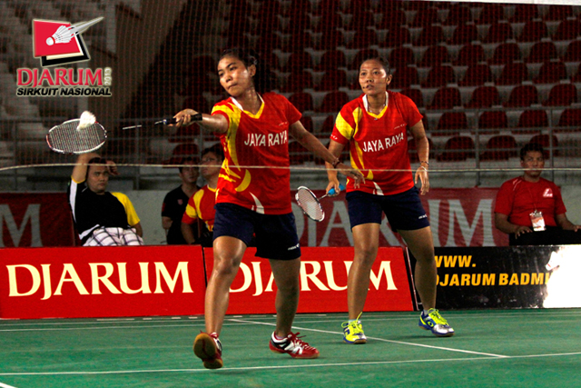 Illa Alvionitasari/Ni Ketut Mahadewi (Jaya Raya Suryanaga) bersiap mengembalikan shuttlecock ke arah Aris Budiharti/Ery Octaviani (Jaya Raya).
