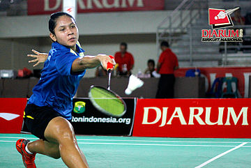 Ganis Nurrahmandani (Pertamina Indonesia) mengembalikan shuttlecock ke arah Novalia Agustianti (Tangkas Specs).