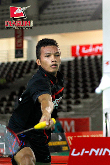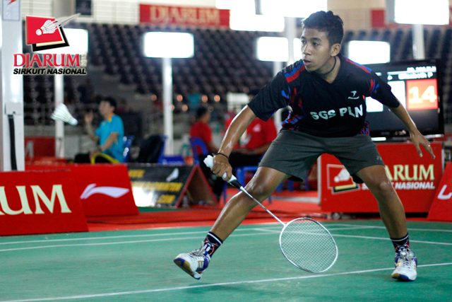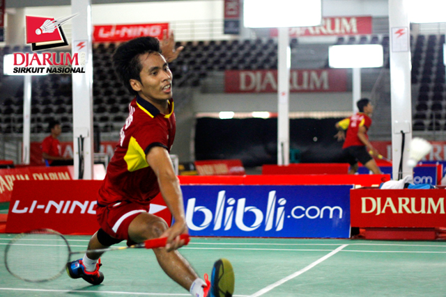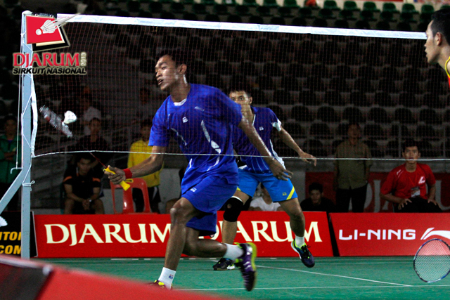 Reksy Aureza (PB Djarum) mengembalikan shuttlecock ke arah Fauzi Adnan (Jaya Raya Suryanaga).
