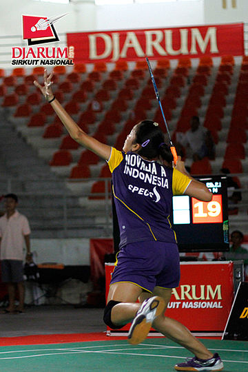 Novalia Agustianti (Tangkas Specs) mengambil ancang-ancang sebelum melepaskan smash.