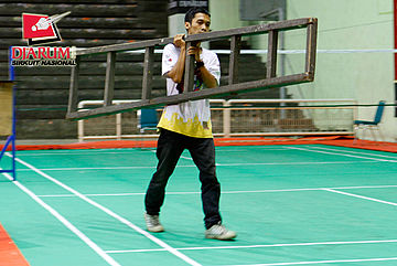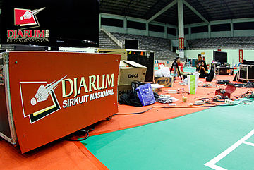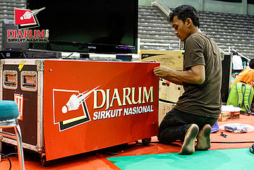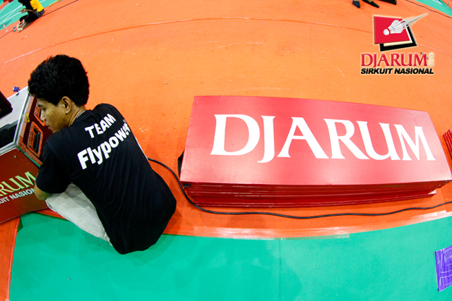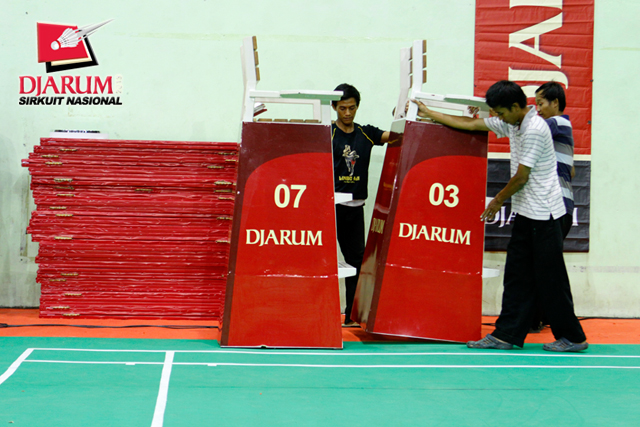Salah satu pekerja siap memasangkan papan Djarum di pinggir lapangan pertandingan.