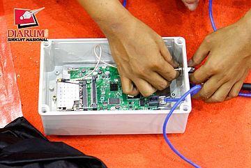 Salah satu anggota tim Live Score saat memasang perangkat kerjanya.