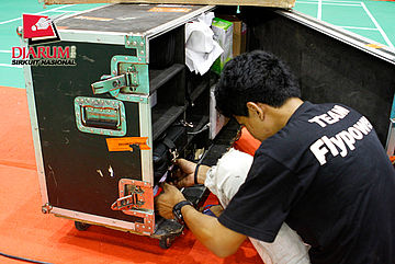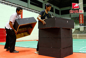 Perlengkapan logistik Djarum Li-Ning Sirkuit Nasional 2013, Semarang siap untuk dipasangkan di pinggir lapangan pertandingan.