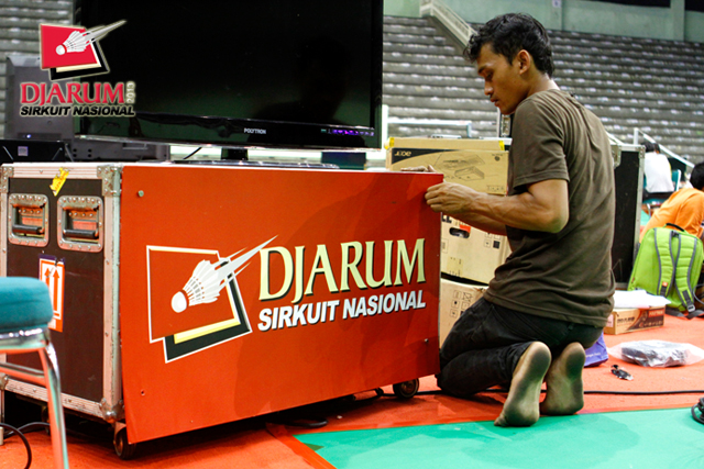 Salah seorang pekerja sedang memasang papan Djarum Sirkuit Nasional di bawah layar live score.