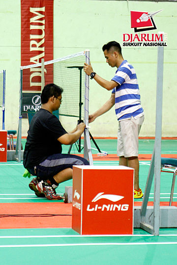 Dua Pekerja saat memasang net di lapangan pertandingan.