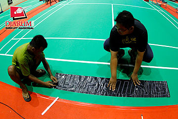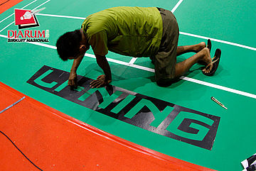 Salah satu pekerja sedang membuat cetakan logo Li-Ning di karpet pertandingan.