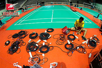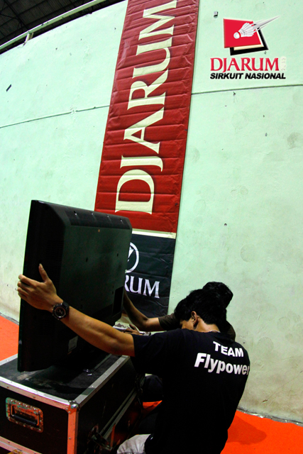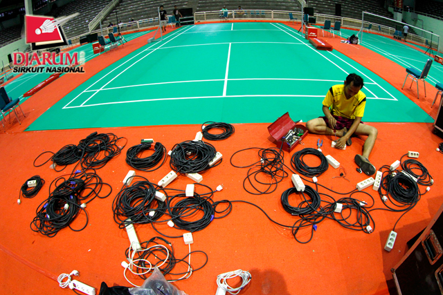 Salah satu anggota tim Live Score saat memasang perangkat kerjanya.