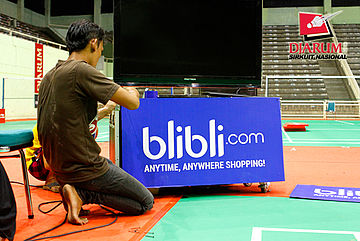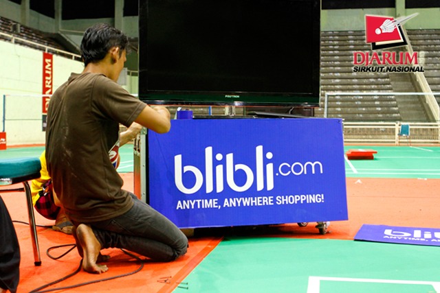 Salah seorang pekerja sedang memasang papan blibli.com di bawah layar live score.