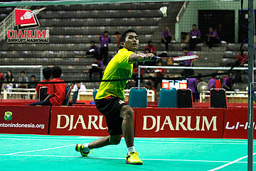 Ryan Fajar (PB Djarum) berhasil mengembalikan shuttlecock ke arah Anthony Sinisuka (Pelatnas).