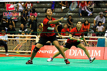 Chintia Rhizta/Ristya Ayu (PB Djarum) mengembalikan shhuttlecock ke arah Jovita Evania/Novalita Anggraeni (Mutiara Bandung).
