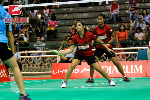Chintia Rhizta/Ristya Ayu (PB Djarum) bersiap mengembalikan shhuttlecock ke arah Jovita Evania/Novalita Anggraeni (Mutiara Bandung).