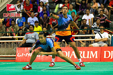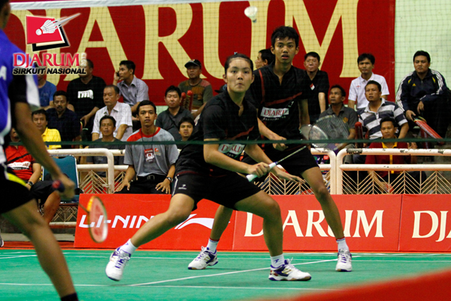 Andika Ramadiansyah/Marsheilla Gischa (PB Djarum) bersiap menyambut pengembalian dari Aji Firmansyah/Bunga Fitriani (Mutiara Bandung).