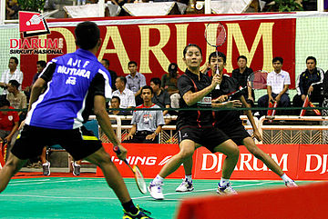 Alamsyah Yunus (Pertamina Indonesia) mengembalikan shuttlecock ke arah Thomi Azizan (Pelatnas).