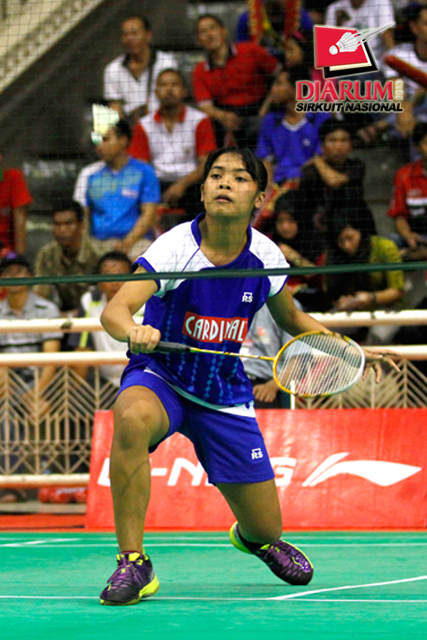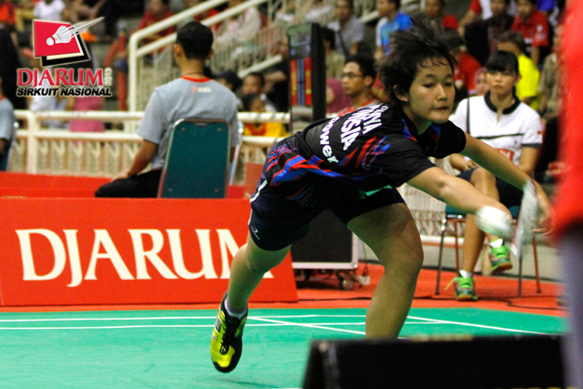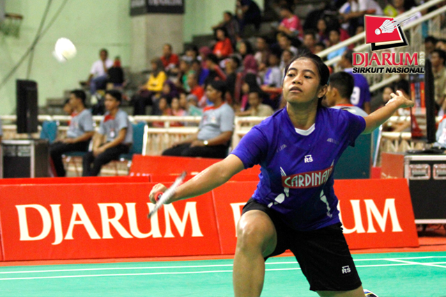 Asty Dwi (Jaya Raya) mengembalikan shuttlecock ke arah Wulan Cahya (PB Djarum).